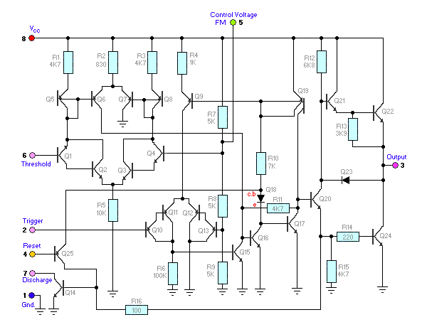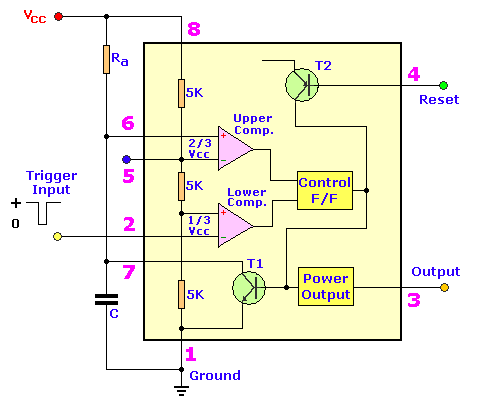 In de 555 is een spanningsdeler van drie gelijke weerstanden (elk van 5 kOhm) ingebouwd, welke de threshold op 2/3 van de voedingsspanning vastlegt en de triggerspanning op 1/3 van de voedingsspanning. Beginnen we met een positieve spanning, welke groter is dan 1/3 van Vcc op de trigger dan zal de comparator omklappen als de trigger kortstondig naar 0 V wordt getrokken. Nu klapt de flipflop ook om en wordt de output hoog (ongeveer gelijk aan Vcc). Is de output hoog dan is de ontlaadtransistor niet geleidend. Omdat de uitgang van deze transistor verbonden is met de externe tijdbepalende condensator kan deze zich nu opladen via een externe weerstand. De spanning over de condensator ligt ook aan pen 6, de "threshold". Als de spanning over deze condensator 2/3 van de voedingsspanning bereikt, klapt de bovenste comparator om en de uitgang wordt laag. De ontlaadtransistor wordt geleidend en ontlaadt de tijdcondensator.