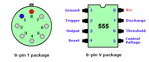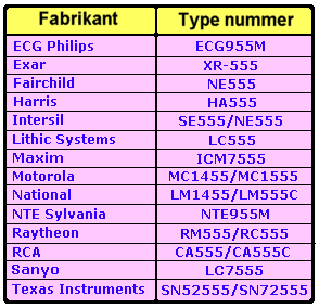 Inleiding. Midden zeventiger jaren bracht Signetics de 555 timer op de markt, een uniek functieblok dat erg populair geworden is. De 555 bestaat uit twee comparatoren, een bistabiele flipflop, een ontlaadtransistor en een spanningsdeler. Hij is in staat om nauwkeurige tijdvertragingen te realiseren, of in oscillatorschakelingen toegepast te worden. Dit gebeurt dan via een externe condensator en een of twee weerstanden. De 555 IC bestaat uit 23 transistors, 2 diodes en 16 weerstanden op een silicium chip in een 8-pin mini DIP (dual inline package) behuizing. Ook is de 555 te verkrijgen in een 8 pens SMD uitvoering. Ook is er de 556, dit zijn 2 555's in 1 behuizing (SMD of DIP), die alleen de voeding delen. De 556 kan dus als volwaardige vervanger van 2 losse 555's gebruikt worden. |