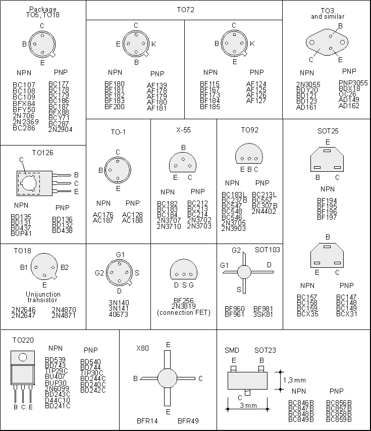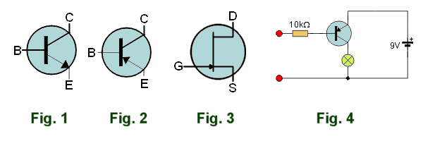 In figuur 3 zien we een Mosfet, als er negatieve spanning op de gate komt te staan dan worden daardoor de elektronen in het substraat daar afgestoten door het elektrisch veld (vandaar de naam FET). daardoor wordt het N type silicium geleidend. Een FET is een speciale transistor (de eerder besproken transistors heten bipolaire transistors), in plaats van dat hij gaat geleiden als er stroom in of uit de basis stroomt gaat een FET geleiden als er spanning op de gate (de basis van een FET) komt te staan. De afkorting FET staat voor "field effect transistor", omdat ze een elektrisch veld gebruiken. Hieronder zien we een lijst met afbeeldingen met aansluitpunten van de meest gangbare type transistoren.