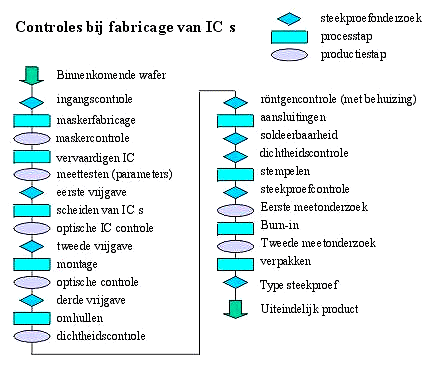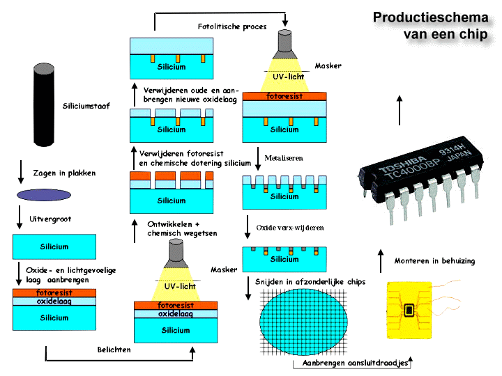 De siliciumplak wordt eerst gesneden uit een siliciumkristal met behulp van een diamantschijf. Het plaatje moet in een welbepaalde richting worden uitgesneden, loodrecht op de kristalstructuur. Bij het in plakken zagen van het silicium gaat 50% van de stof verloren, omdat de zaagsnede even dik is als de plaatjes zelf. Nadat het plaatje werd uitgezaagd wordt het eerst gelept. Dat heeft als doel het exact plat te maken en daarvoor wordt een bepaald schuurmiddel gebruikt. Dit leppen heeft ook nog het doel om de schijf op de juiste dikte te krijgen. Om dan bepaalde diffusietechnieken te kunnen toepassen wordt één van de zijden gepolijst, waarbij de geringste oneffenheden en kristalfouten worden weggewerkt. Op één siliciumplak worden meerdere IC of chips gemaakt, die dan later worden gescheiden. Vervolgens wordt er een dikke laag oxide op het silicium aangebracht (5000 - 6000 A, 1 A = 10-10), dit gebeurd onder enorm hoge temperaturen. De lading van het plaatje is positief of negatief. Dan brengt men een lichtgevoelige laag aan, Fotoresist. Deze laag wordt belicht met UV licht, bepaalde delen zijn beschermd door een masker. Dat masker bevat de vorm van de chip, n.l. de plaatsen waar wel en niet belicht mag worden om de volledig werkende chip te verkrijgen. Het ontwikkelen van een masker is al een proces op zich, maar dat valt buiten het hier besproken gebied. De lichtgevoelige stof wordt dan fotografisch ontwikkeld. De belichte delen worden verwijderd. Om de oxidelaag chemisch weg te etsen in de ontstane openingen gebruikt men een zuur, de rest van de plaat krijgt bescherming van de Fotoresistlaag. De rest van de lichtgevoelige stof wordt verwijderd. Een thermische 'dotering' moet voor een bepaalde elektrische lading zorgen in de gleuven (in de oxidelaag). De dotering is eigenlijk een soort 'vervuiling', er wordt onder hoge temperaturen geforceerd dat de lading van het blootliggende silicium verandert. Er wordt nu een nieuwe, dikkere oxidelaag aangebracht (bv 10 000 tot 15 000 A). Nu wordt er weer een fotolytisch proces (met behulp van licht) uitgevoerd om de plaatsen te etsen waar er gemetalliseerd moet worden. Een uiterst dunne oxidelaag wordt aangebracht, die bij de source en drain terug worden weggeëtst. De schakeling kan nu gemetalliseerd worden. De IC's zijn nu klaar en worden van elkaar gescheiden door een roterend zaagblad. Met deze zaag is men in staat om in de zogenaamde krasbanen, die tussen de IC's lopen, te zagen zonder de schakeling te beschadigen. Daarna volgt het bonderen. Bonderen houdt in dat de aansluitpunten worden voorzien van een gouddraadje om de communicatie met de buitenwereld mogelijk te maken. De IC wordt vervolgens in een behuizing geplaatst. Een standaard behuizing van kunststof of keramiek kan vervangen worden door behuizingen met speciale eigenschappen. Zoals een behuizing met een lage warmteweerstand om de ontstane warmte bij de chip zo goed mogelijk af te voeren. Behuizingen met een venster of die volledig doorzichtig zijn voor geïntegreerde schakelingen die voorzien zijn van sensoren. De testfase is bij IC's zeer belangrijk en zit volledig in het productieproces verweven. Een gecompliceerde IC 100% testen op de werking is bijna onmogelijk. Hieronder vind je een soort schema van alle controles die worden uitgevoerd tijdens het proces: Het moet duidelijk zijn dat dit enkel een voorbeeld is. Niet iedere chip is noodzakelijk op die manier gefabriceerd, maar deze beschrijving heeft een idee wat het proces inhoud.