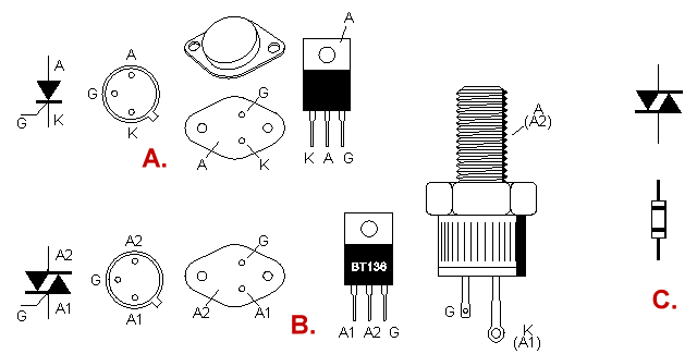 | Een triac (triode for alternating current) is een elektronische component die tot de categorie van de halfgeleiderschakelaars behoort. Een triac kan opgebouwd worden gedacht als twee antiparallel geschakelde thyristoren en daarmee als een speciale variant van de thyristor worden gezien. In werkelijkheid is de triac echter opgebouwd uit één halfgeleiderkristal. Een triac heeft drie aansluitingen: elektrode 1, elektrode 2 en gate, er kan niet van anode en kathode gesproken worden omdat de polariteit bij deze component niet vast ligt, zoals bij de thyristor. Toch hanteren sommige fabrikanten de aanduiding A1 en A2. In het Engels spreekt men van main terminal, MT1 en MT2. |
