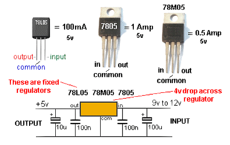 A simple power supply can be made with a component called a "3-pin regulator or 3-terminal regulator" It will provide a very low ripple output (about 4mV to 10mV provided electrolytics are on the input and output. The diagram above shows how to connect a regulator to create a power supply. The 7805 regulators can handle 100mA, 500mA and 1 amp, and produce an output of 5v, as shown. These regulators are called linear regulators and drop about 4v across them - minimum. If the current flow is 1 amp, 4watts of heat must be dissipated via a large heatsink. If the output is 5v and input 12v, 7volts will be dropped across the regulator and 7watts must be dissipated. |