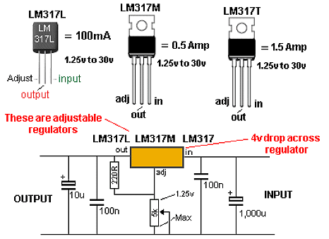 The LM317 regulators are adjustable and produce an output from 1.25 to about 35v. The LM317T regulator will deliver up to 1.5amp. |