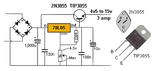 The output current of all 3-terminal regulators can be increased by including a pass transistor. This transistor simply allows the current to flow through the collector-emitter leads. The output voltage is maintained by the 3-terminal regulator but the current flows through the "pass transistor." This transistor is a power transistor and must be adequately heatsinked. Normally a 2N3055 or TIP3055 is used for this application as it will handle up to 10 amps and creates a 10 amp power supply. The regulator can be 78L05 as all the current is delivered by the pass transistor. |