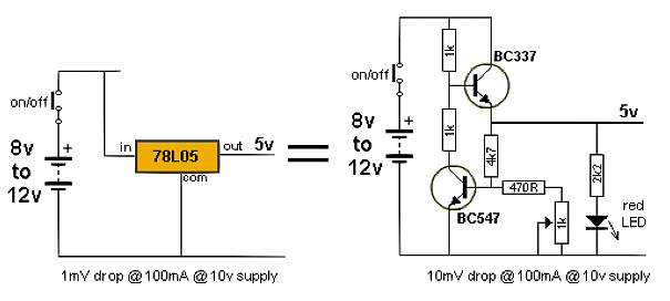 This circuit takes the place of a 78L05 3-terminal regulator. It produces a constant 5v @ 100mA. You can use any old cells and get the last of their energy. Use an 8-cell holder. The voltage from 8 old cells will be about 10v and the circuit will operate down to about 7.5v. The regulation is very good at 10v, only dropping about 10mV for 100mA current flow (the 78L05 has 1mV drop). As the voltage drops, the output drops from 5v on no-load to 4.8v and 4.6v on 100mA current-flow. The pot can be adjusted to compensate for the voltage-drop. This type of circuit is called a LINEAR REGULATOR and is not very efficient (about 50% in this case). See circuit 2 below for BUCK REGULATOR circuit (about 85% efficient).