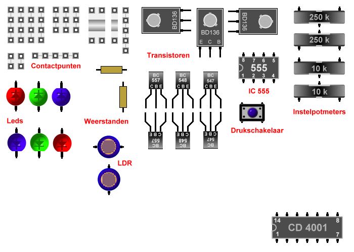 Hieronder de afbeeldingen van componenten die voor het insteekbord (Breadboard) worden gebruikt.